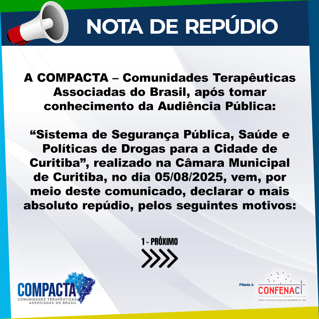 A COMPACTA – Comunidades Terapêuticas Associadas do Brasil – vem a público demonstrar nosso mais absoluto repúdio à Audiência Pública: “Sistema de Segurança Pública, Saúde e Políticas de Drogas para a Cidade de Curitiba”, realizada no dia 05/08/2025, na Câmara Municipal de Curitiba!